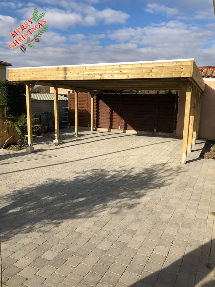 Nous avons également conçu et mis en place un grand carport sur l’ensemble de la maison. Le pourtour de la maison a été aménagé en posant des graviers et des bordures pour une finition parfaite.
