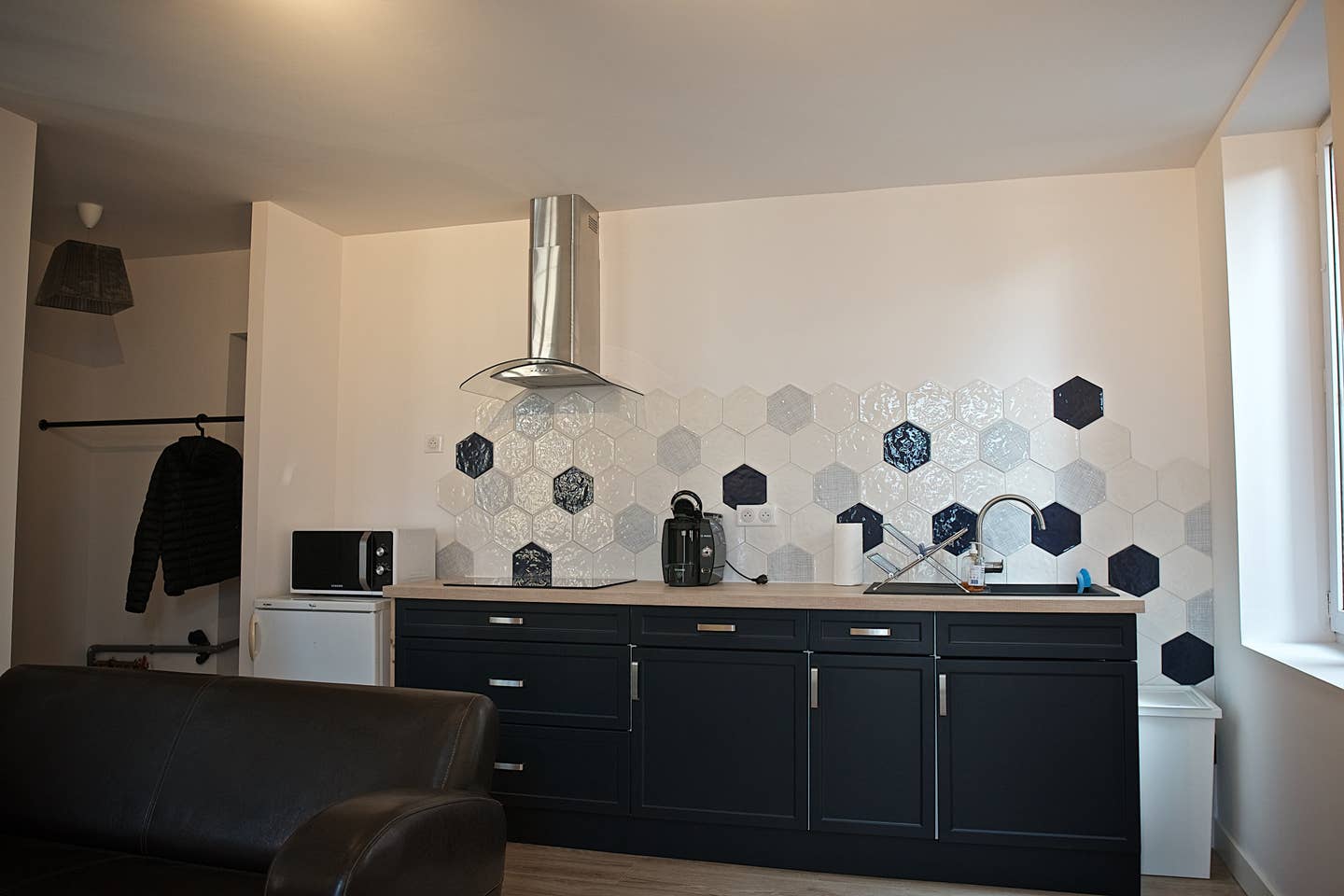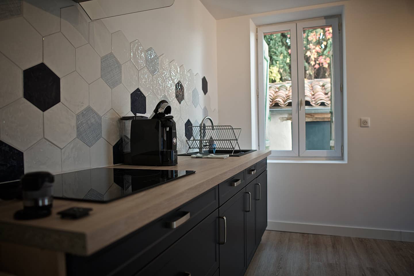Nous avons posé du sol pvc en lames, nous avons installé une verrière dans le mur et nous avons posé une cuisine.
