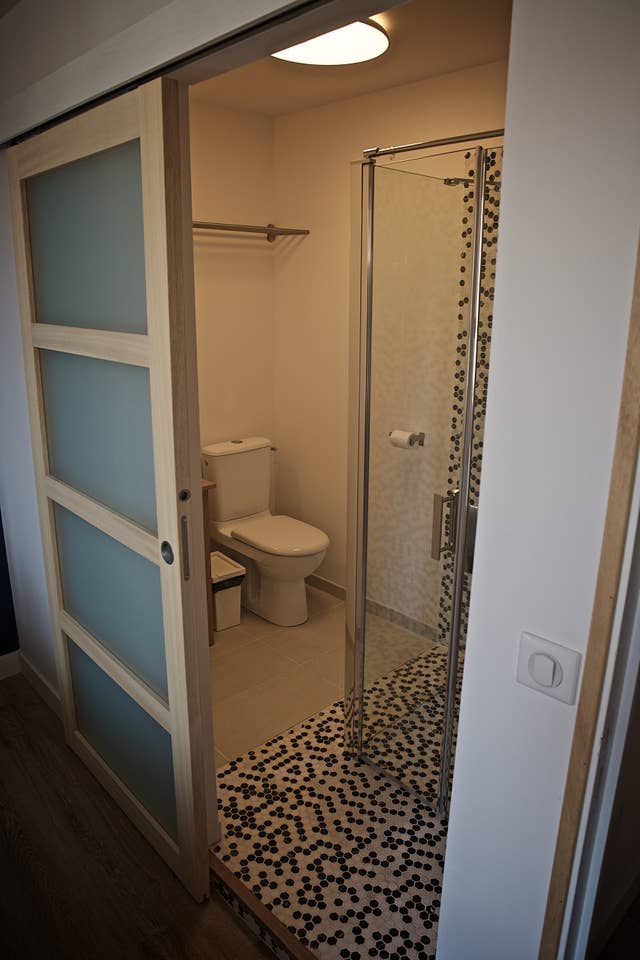 Nous avons cassé l’ensemble des cloisons de cet appartement, et nous avons déposé l’ensemble des éléments sanitaires. Une chambre et une salle de bain ont été créer. L’ensemble de l’électricité a été refaite, nous avons refait la distribution de plomberie en intégrant un ballon d’eau chaude plat afin de gagner de l’espace.
